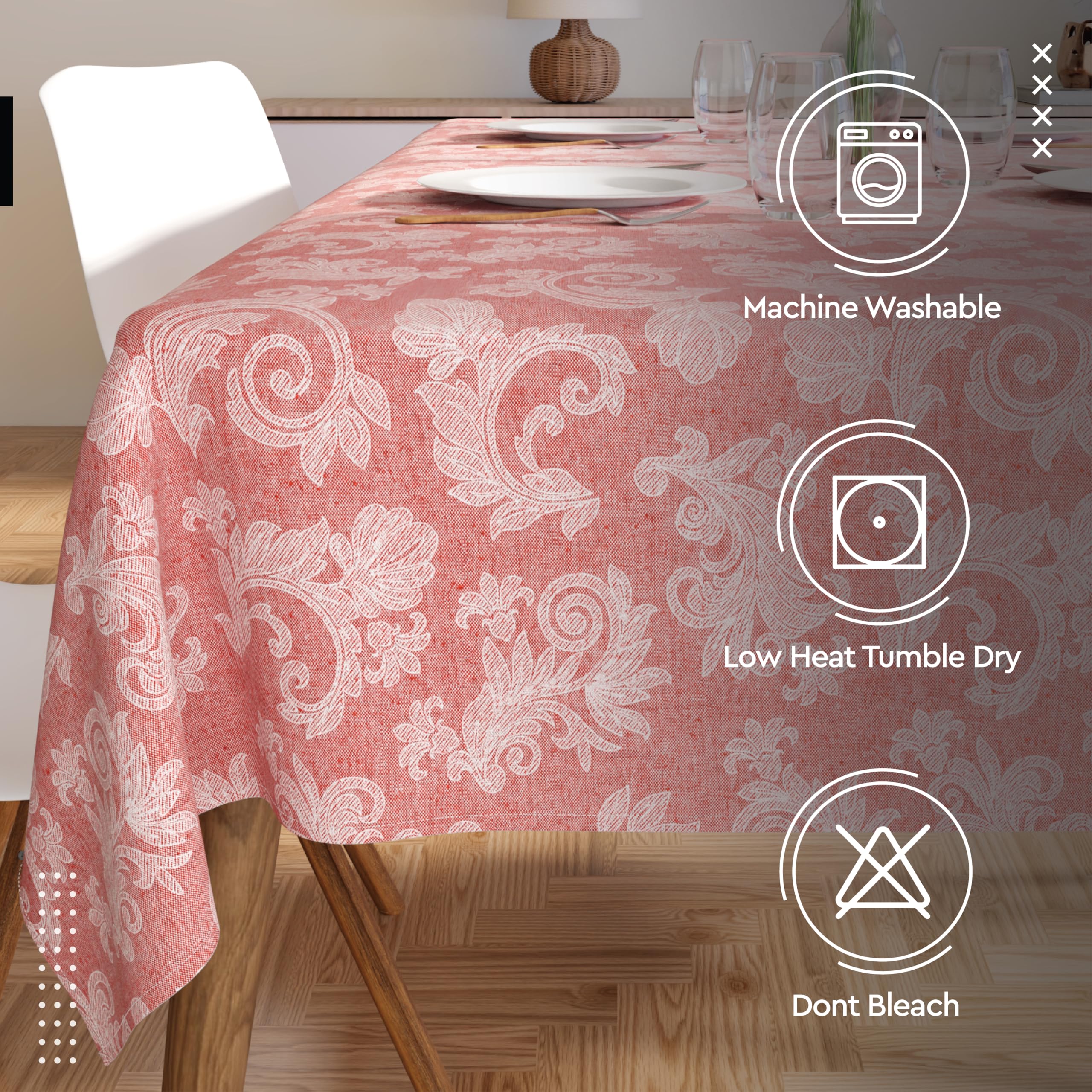 - EASY TO CARE: This chambray cotton table cover is machine washable, making it easy to keep clean. It retains its vibrant color and pattern even after repeated washings. For best results and to minimise shrinkage, we recommend washing in cold water and tumble drying on low.