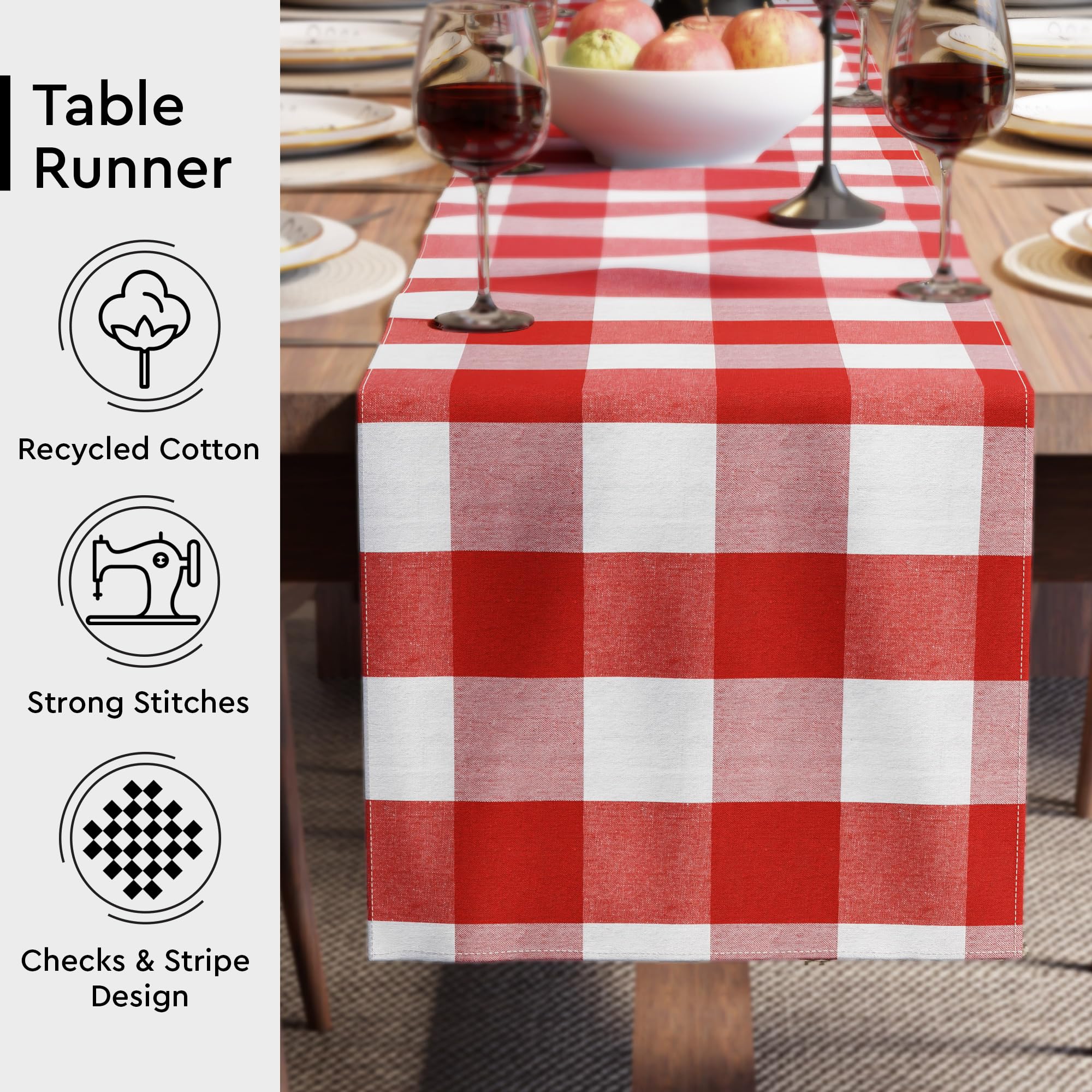 Encasa XO Cotton Dining Table Runner | Buffalo Red Checks | Size 13x72 in - Machine Washable & Durable